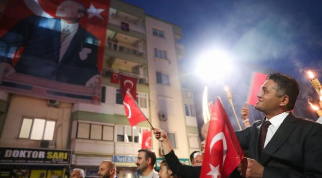 Metrelerce uzunluktaki korteje Aliağa Kaymakamı Zekeriya Güney, Aliağa Belediye Başkanı Serkan Acar, Garnizon Komutanı Albay Faruk Altun, Aliağa Cumhuriyet Başsavcısı Mehmet İmir, belediye meclis üyeleri, siyasi parti yöneticileri, sivil toplum kuruluşları ile Aliağalılar katıldı. Kortejin Avcı Ramadan Çocuk Oyun ve Rekreasyon Alanı'na varmasıyla birlikte gerçekleştirilen tekne gösterileri ilgiyle izlenirken ay yıldızlı köprüde yakılan meşaleler geceyi aydınlattı.