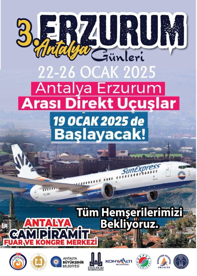 Antalya ile Erzurum arasında direkt uçuşların 19 Ocak 2025’te başlamasıyla birlikte, iki şehir arasındaki bağlar daha da güçlenecek. Bu tarihi gelişmeyle eş zamanlı olarak, Antalya Cam Piramit Fuar ve Kongre Merkezi’nde 22-26 Ocak 2025 tarihleri arasında Üçüncü Erzurum Günleri düzenlenecek.