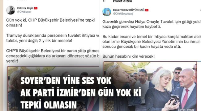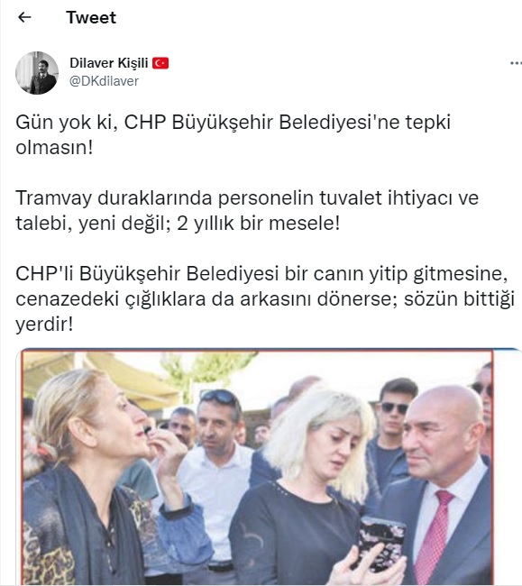 AK Parti İzmir İl Başkan Yardımcısı Dilaver Kişili ise, ‘’Gün yok ki, CHP Büyükşehir Belediyesi'ne tepki olmasın! Tramvay duraklarında personelin tuvalet ihtiyacı ve talebi, yeni değil; 2 yıllık bir mesele! CHP'li Büyükşehir Belediyesi bir canın yitip gitmesine, cenazedeki çığlıklara da arkasını dönerse; sözün bittiği yerdir!’’ paylaşımında bulundu.