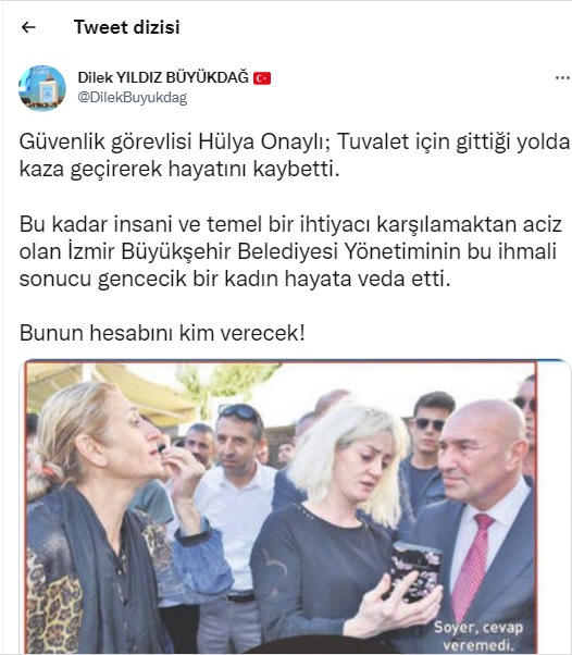 İzmir Büyükşehir Belediyesi tarafından işletilen tramvayda, 2 yıl önce gündeme gelen ve önceki gün tuvalet ihtiyacı için yolun karşısına geçmeye çalışırken bir aracın çarpması sonrası 2 çocuk annesi Hülya Onaylı’nın ölümü ile sonuçlanan olayla ilgili AK Parti İzmir’den, Büyükşehir Belediyesi’ne tepki geldi. AK Parti İzmir İl Kadın Kolları Başkanı ve İzmir Büyükşehir Belediye Meclis Üyesi Dilek Yıldız Büyükdağ, sosyal medya hesabından yaptığı paylaşımda, ‘’Güvenlik görevlisi Hülya Onaylı; Tuvalet için gittiği yolda kaza geçirerek hayatını kaybetti. Bu kadar insani ve temel bir ihtiyacı karşılamaktan aciz olan İzmir Büyükşehir Belediyesi Yönetiminin bu ihmali sonucu gencecik bir kadın hayata veda etti. Bunun hesabını kim verecek! Hülya kardeşimize Allah’tan rahmet; Ailesine ve tüm sevenlerine baş sağlığı diliyorum. Mekanı Cennet Olsun.’’ İfadelerini kullandı.