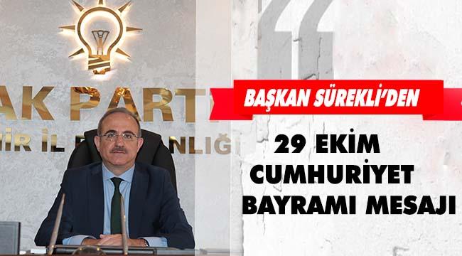 AK Parti İzmir İl Başkanı Kerem Ali Sürekli; "29 Ekim Cumhuriyet Bayramı" dolayısıyla bir kutlama mesajı yayımladı. Başkan Sürekli mesajında; asırlarca hürriyetinden ve maneviyatından taviz vermeyen Türk Milleti’nin, destansı kurtuluş mücadelesi ile küllerinden doğuşunun en büyük nişanesi olduğunu belirterek şu ifadelere yer verdi; ‘’Atalarımızın canlarını vererek, kanlarını dökerek bize vatan yaptığı bu topraklar; dünyanın bin yıldır üzerinde senaryolar yazdığı, oyunlar oynadığı, büyük bir değerdir. Varlığına ve hürriyetine kasteden düşmana, tarihi bir cevap veren Türk Milleti; cesaretin, azmin ve kararlılığın timsalidir. Bizler de, milletimizle birlikte, bu değere halel getirmemek için canla başla çalışıyor, tüm kumpasları tersine çevirerek, mücadelemizi sürdürüyoruz. Cumhuriyet ve kazanımlarının ne anlama geldiğinin idraki içinde; Türkiye Cumhuriyeti Devleti’nin kurucusu Gazi Mustafa Kemal Atatürk’ün ilke ve inkılaplarına sahip çıkarak hedeflerimizi büyütüyoruz.’’ dedi.