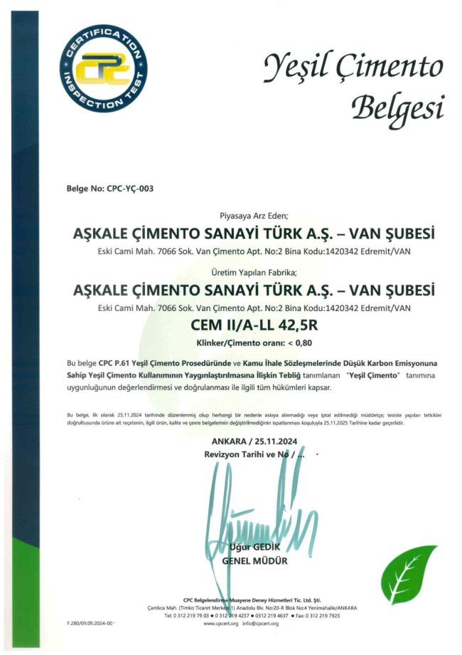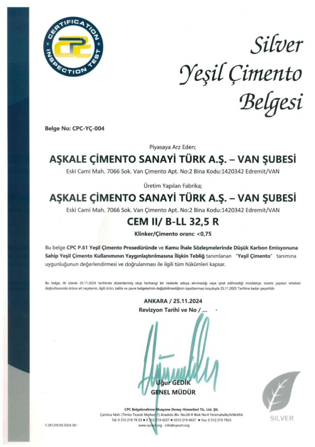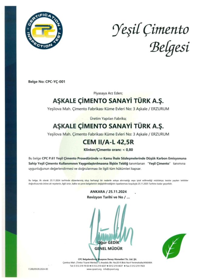 Aşkale Çimento’ya ait tesislerde kullanılan tüm üretim sistemleri, çevre dostu teknolojilerle donatılmış olup, emisyonve toz salınımı sürekli olarak modern filtre sistemleri ile kontrol altında tutulmaktadır. Çevresel etkiler, Çevre, Şehircilik ve İklim Değişikliği Bakanlığı tarafından da düzenli olarak denetlenmekte ve gerekli tüm izin belgeleri eksiksiz olarak güncellenmektedir.