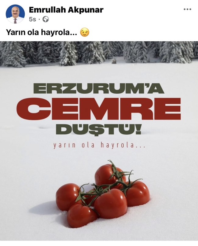 Haber/Yorum: Sercan Çetin- Aziziye Belediye Başkanı Emrullah Akpunar’ın sosyal medya paylaşımı gündeme bomba gibi düştü. “Erzurum’a Cemre Düştü” mesajıyla karların üzerine yerleştirilmiş domateslerin olduğu bir görsel paylaşan Akpunar, kamuoyunda büyük merak uyandırdı. Ancak asıl soru şu: Başkan Akpunar, önceki dönem belediye başkanı Muhammed Cevdet Orhan’ın başlattığı termal domates serası projesini mi sürdürecek, yoksa tamamen yeni bir girişimle mi karşımıza çıkacak?