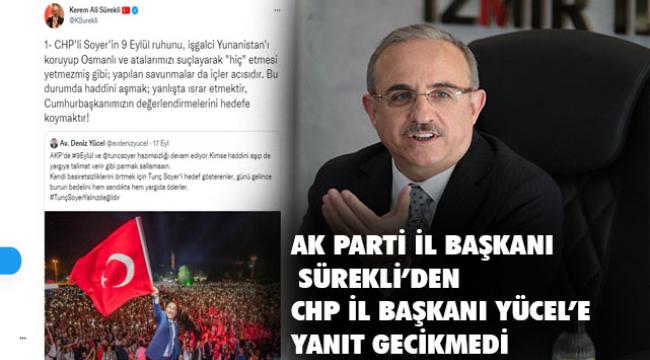 Başkan Sürekli, yaptığı paylaşımda şunları dile getirdi ''CHP'li Soyer'in 9 Eylül ruhunu, işgalci Yunanistan'ı koruyup Osmanlı ve atalarımızı suçlayarak "hiç" etmesi yetmezmiş gibi; yapılan savunmalar da içler acısıdır. CHP'li Soyer'in 9 Eylül ruhunu, işgalci Yunanistan'ı koruyup Osmanlı ve atalarımızı suçlayarak "hiç" etmesi yetmezmiş gibi; yapılan savunmalar da içler acısıdır. Bu durumda haddini aşmak; yanlışta ısrar etmektir, Cumhurbaşkanımızın değerlendirmelerini hedefe koymaktır! Tarihi gerçeklerimiz ve milli değerlerimize zehirli oklarını yöneltenlerin, bu ülkenin Cumhurbaşkanı'na saygı göstermesini beklemek de abesle iştigal olur! Türkiye hukuk devletidir herkes hukuk önünde eşittir! Ve kimse bu ülkenin Cumhurbaşkanı’nı tehdit edemez! Herkes, haddini bilmelidir. Yargı, 'Vatanın Bölünmez Bütünlüğü' ilkesi ve 'Nefret Suçu' işleyenlerin yanıtını elbette verecektir.