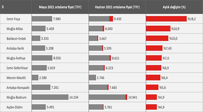 Hepsiemlak Haziran 2021 Emlak Endeksi verilerine göre son 1 ayda en çok fiyatı artan yazlık illere baktığımızda ise Hatay, Aydın ve Muğla öne çıkıyor. Bu üç ilimizde aylık fiyat artışı %6-10 arasında.