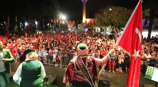 Eş zamanlı olarak düzenlenen etkinlikler, kortej yürüyüşleriyle başladı. Türk Bayrakları ve meşalelerle meydanlara yürüyen binlerce vatandaş coşkuyla marşlar okudular. Bodrum Belediye Meydanında Sunucu Ateş’in, Turgutreis Atatürk Meydanında ise Banu Tarancı’nın sunumlarıyla karşılanan vatandaşların coşkusu bir kat daha arttı.