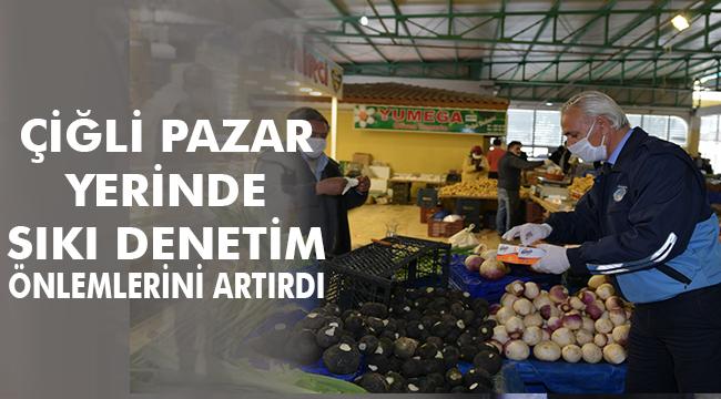 Zabıta ekiplerince pazar yerlerinde yoğunluk oluşturulmaması için giriş ve çıkışlar kontrol altına alındı. Bu amaçla pazar yerlerindeki kapı sayısı azaltılarak Çiğli sakinlerinin pazar yerlerine giriş çıkışları içerideki yoğunluğa göre ayarlandı. Emniyet mensupları ile birlikte yapılan kimlik kontrollerinde ise 2000 yılından sonra doğanlar ile 60 üstü yaş alanlar da pazar yerlerine alınmadı. 20 yaş altı pazarcı esnafı da evlerine gönderildi. Maskesiz dolaşma yasağı getirilen semt pazar yerleri girişinde hem pazarcı esnafına hem de maskesi bulunmayan vatandaşa zabıta ekiplerince maske dağıtıldı.