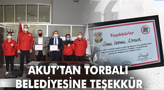 2013 yılında AKUT’a eğitim ve tatbikat çalışmaları yapabilmeleri için Pancar’da, belediyeye ait olan 400 metrekarelik bir merkezi üs olarak tahsis eden Torbalı Belediyesi, İzmir depreminde de AKUT’a teçhizat, istihkam malzemeleri, yakıt, ulaşım ve kişisel ihtiyaçlarını gidermeleri ve konaklamaları için otel temin etmişti. Torbalı Belediyesi’nin desteğini deprem boyunca omuzlarında hissettiklerini ifade eden AKUT İzmir Ekip Lideri Ramazan Ergut, Torbalı Belediye Başkan Yardımcısı Ali Yakupoğlu ve Kültür Sosyal İşler Müdürü Serkan Tekin’e ‘Teşekkür Belgeleri’ takdim etti. Ergut ayrıca, Torbalı Belediye Başkanı İsmail Uygur için de hazırlattıkları belgeyi, Tekin’e takdim etti.