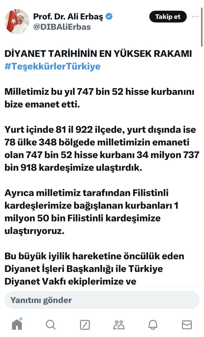 Bu büyük iyilik hareketine öncülük eden Diyanet İşleri Başkanlığı ve Türkiye Diyanet Vakfı ekiplerine teşekkür eden Erbaş, aynı zamanda hayırsever milletimize de şükranlarını sundu. "Teşekkürler Türkiye" ifadesiyle sonlandırdığı mesajında, bu organizasyonun başarısında emeği geçen herkese minnettarlığını dile getirdi.