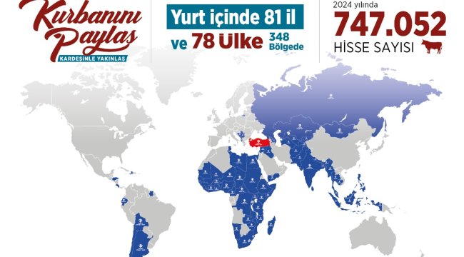 Bu yıl Türkiye genelinde ve dünyanın dört bir yanında toplam 747 bin 52 hisse kurban, Diyanet İşleri Başkanlığı'na emanet edildi. Bu kurbanlar, yurt içinde 81 il ve 922 ilçede, yurt dışında ise 78 ülke ve 348 bölgede ihtiyaç sahiplerine ulaştırıldı. Toplamda 34 milyon 737 bin 918 kişi, bu iyilik hareketinden faydalandı.