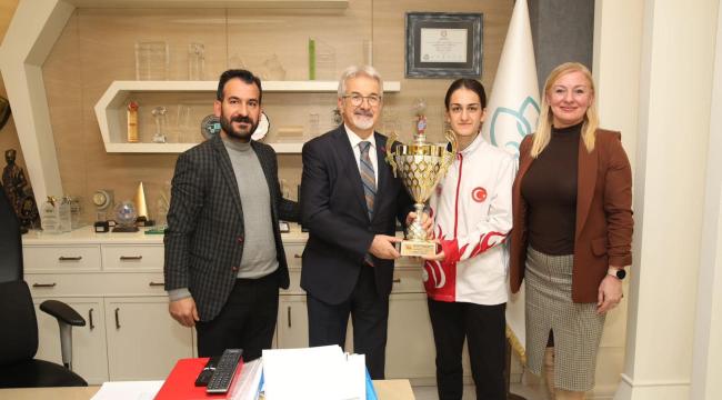 Başarılı sporcu yeni sezon öncesi hazırlıklarını Bursa’da kendi imkanlarıyla sürdürürken; Nilüfer Belediye Başkanı Turgay Erdem ve Nilüfer Belediyesi CHP Meclis Üyesi Mesut Şehitoğlu genç yeteneği makamlarında ağırladı.