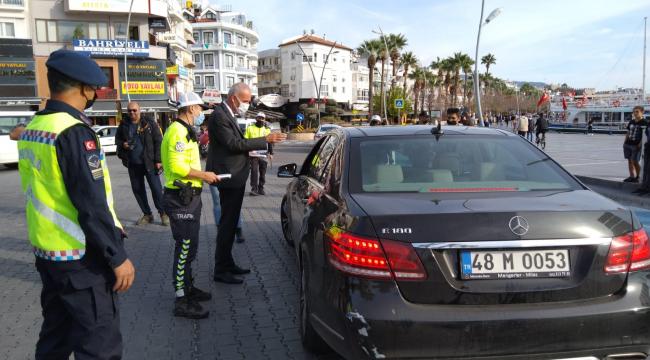 Marmaris Kaymakamı Ertuğ Şevket Aksoy; katıldığı trafik uygulamasında emniyet kemeri takılı sürücülere maske hediye ederken, takmayanlara da sadece uyarıcı broşür verdi.