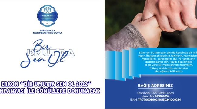 Erzurum Konfederasyonu (ERKON) un başlattığı İstanbul’daki Erzurum Federasyonları ve Erzurum Dernekleri ile birlikte yürütülecek ‘BİR UMUTTA SEN OL - 2022’ Kampanyası, Avrupada kurulan Avrupa Erzurumlular Birliği`nin de desteklediği ile ihtiyaç sahibi ailelere, geleneksel hale gelen ‘kumanya yardım kolileri alış/veriş kartları ve nakdi para yardımları yapılacak.