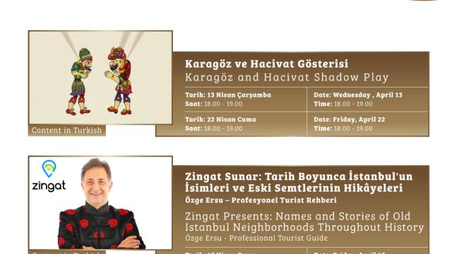 13 Nisan Çarşamba _ 18:00-19:00 / Karagöz ve Hacivat Gösterisi: Galataport İstanbul sahasında Nostalji İstanbul etkinlikleri kapsamında katılımın ücretsiz olduğu Hacivat Karagöz gösterisi çocuklarla buluşacak. 7'den 70'e herkesin bir Türk Ortaoyunu Geleneği ile yüzünü güldüren Hacivat Karagöz çağımızın teknoloji ağırlıklı etkinliklerinden de nefes alabilmek için çocuklara bir alternatif sunuyor.