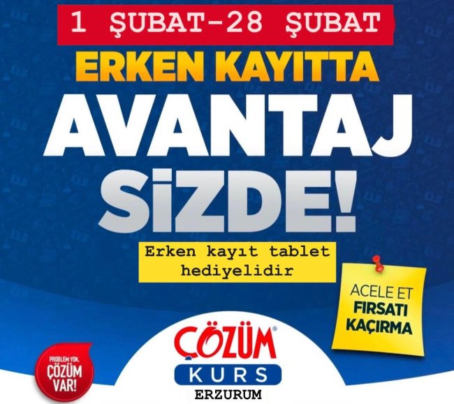 Öte yandan, 1-28 Şubat tarihleri arasında indirimli erken kayıt fırsatı sunan Erzurum Çözüm Eğitim Kurumları, bu süre içinde kaydolan tüm öğrencilere tablet hediye edecek. Eğitimde teknolojiyi destekleyen bu avantajlı kampanya, öğrencilere önemli bir fırsat sunuyor.