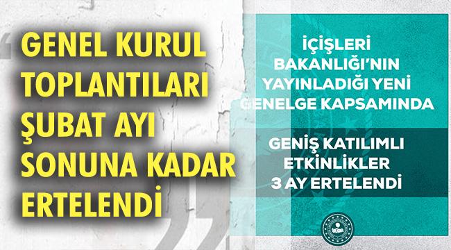 Dernek genel kurullarının ertelenmesine ilişkin durum doğrultusunda; daha önceden 01.12.2020 tarihine kadar yapılmaması kararlaştırılan, sivil toplum kuruluşları, kamu kurumu niteliğindeki meslek kuruluşları ve üst kuruluşları, birlikler ve kooperatifler tarafından düzenlenecek etkinlikler ve genel kurul toplantıları 01.03.2021 tarihine kadar ertelenmesi gerektiği değerlendirildi.