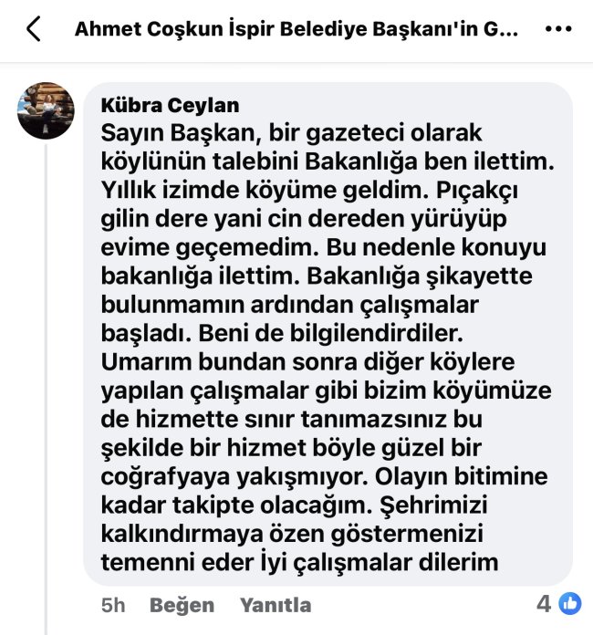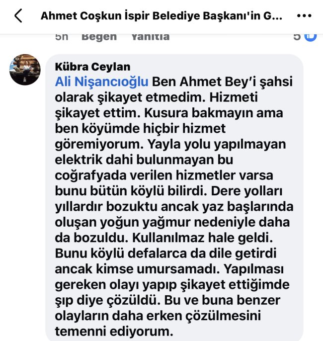 İspirli Gazeteci Kübra Ceylan da belediye hizmetlerine yönelik eleştirilerini dile getirdi. Yıllık izni sırasında köyüne gelen Ceylan, yıllardır köyüne doğru düzgün hizmet yapılmadığını ve kendi köyü dahil birçok bölgenin ihmal edildiğini belirtti. Bu duruma dikkat çeken Ceylan, sadece güzel bir coğrafyada yaşamanın yetmeyeceğini , belediyecilik hizmetlerinin de bu coğrafyaya yakışması gerektiğine vurgu yaparak eleştirilerini sosyal medya hesabından paylaşıyor.