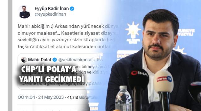 Sosyal medya hesabından CHP’li Mahir Polat’a cevap veren AK Partili Eyyüp Kadir İnan, şu ifadelere yer verdi, ‘’Mahir abiciğim :) Arkasından yürünecek dünya lideri herkese kısmet olmuyor maalesef... Kasetlerle siyaset dizaynı, itibar suikastleri, terörist seviciliğin ayıbı yazmıyor sizin kitaplarda herhalde... Yanı başındaki taşkın'a dikkat et alamut kalesinden notlar iliştirmesin dünyanıza...’’