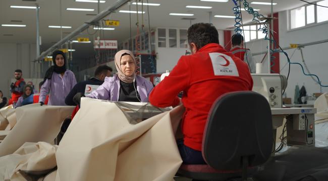 Kızılay ekipleri, deprem bölgesindeki AFAD’ın koordinasyonunda yürütülen barınma ihtiyacının giderilmesine destek olmak için atölye ve fabrikalarında AFAD çadırlarının üretimini gece gündüz sürdürüyor. 16,5 m2 olarak üretilen çadırlar kış şartlarına uygun olarak çift katmanlı olarak imal ediliyor. Zemin ve tavan su itme özellikli PVC materyalden üretilirken, iç katmanda ise keçe kullanılıyor. Ebeveyn alanı ve çocuk alanı olmak üzere iki bölmeden oluşan çadırların girişinde, mutfak olarak kullanılan ve soba kurmaya da uygun bir alan yer alıyor. Kızılay, Ankara ve Erzincan’da bulunun fabrikalarında yaklaşık 550 çalışanıyla her gün 500 çadır üreterek afet bölgesinde AFAD kullanımına sevk ediyor.