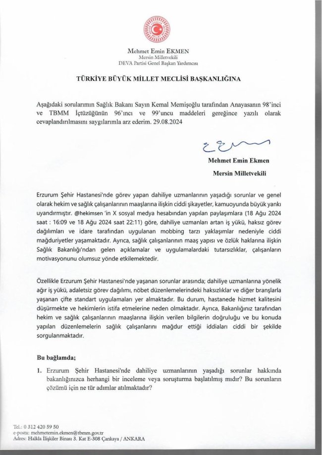 Mersin Milletvekili Ekmen, Erzurum Şehir Hastanesi’nde görev yapan dahiliye uzmanlarının artan iş yükü, haksız görev dağılımları ve idare tarafından uygulanan mobbing tarzı yaklaşımlar nedeniyle ciddi mağduriyetler yaşadığını belirtti. @hekimsen'in X sosyal medya hesabından yapılan paylaşımlarda da bu sorunların dile getirildiğini ve kamuoyunda büyük yankı uyandırdığını vurgulayan Ekmen, "Bu durum, hastanede hizmet kalitesini düşürmekte ve hekimlerin istifa etmelerine neden olmaktadır," dedi.
