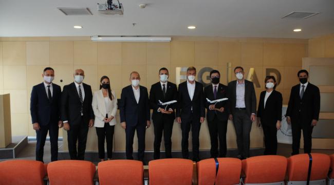 SunExpress Ceo’su Dr. Max Kownatzki, Deputy CEO’su Ahmet Fevzi Çalışkan, Ticaret Direktörü Peter Glade, Türkiye Satış Müdürü Ece Şenev, Ege Bölgesi Satış Müdürü Eray Mert ve beraberindeki heyet, EGİAD’ı ziyaret etti. EGİAD Yönetim Kurulu Başkanı Alp Avni Yelkenbiçer, Başkan Vekilleri Cem Demirci, Dr. Fatih Mehmet Sancak ve Genel Sekreter Prof. Dr. Fatih Dalkılıç’ın ev sahipliğinde gerçekleşen toplantıda İzmir’e özel ilgisi bulunan Dr. Kownatzki’ye EGİAD faaliyet ve projeleri hakkında bilgi verildi.