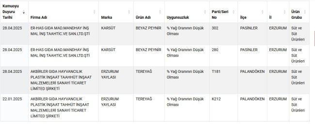 Listenin bir diğer dikkat çeken ismi ise Akbirler Gıda Hayvancılık Plastik İnşaat Taahhüt İnşaat Malzemeleri Sanayi Ticaret Ltd. Şti. oldu. Şirketin “Erzurum Yaylası” markasıyla piyasaya sunduğu tereyağında da yağ oranının düşük olduğu tespit edildi. Akbirler Gıda, daha önce de 22 Ocak 2025 tarihinde aynı üründe benzer bir usulsüzlük nedeniyle Tarım ve Orman Bakanlığı tarafından ifşa edilmişti. Bu durum, firmanın kısa süre içinde ikinci kez aynı gerekçeyle kamuoyuna duyurulmasına yol açtı.