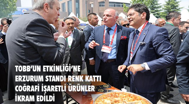 Bu yıl 80.'si gerçekleştirilen Türkiye Odalar ve Borsalar Birliği (TOBB) Genel Kurulu öncesinde etkinlik çerçevesinde birlik bahçesinde kurulan Erzurum standına , Türkiyenin çeşitli bölgelerinden katılım sağlayan Oda ve Borsaların Başkan, delege ve misafirlerine Erzurum iline ait coğrafi işaretli yöresel ürünler ikram edildi.