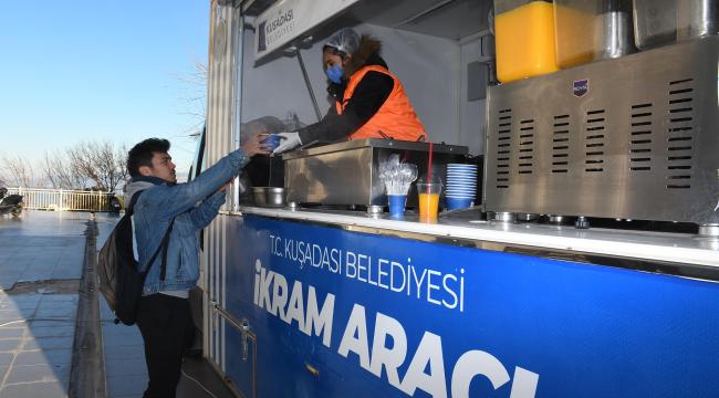 Sosyal Belediyecilik alanında yaşama geçirdiği projelerle dikkat çeken Kuşadası Belediyesi’nin kentte öğrenim gören üniversite öğrencilerine desteği sürüyor. Öğrencilere, ARYA AŞ’nin Gazibeğendi tesislerinde her akşam ücretsiz akşam yemeği veren Kuşadası Belediyesi, final sınavları başlayan ADÜ Turizm Fakültesi öğrencilerine sıcak çorba ve taze sıkılmış meyve suyu ikramında bulunmaya başladı. Sınav haftası boyunca devam edecek uygulama sayesinde güne içleri ısınarak başlayan öğrenciler ikramlardan dolayı Kuşadası Belediye Başkanı Ömer Günel’e teşekkür etti.