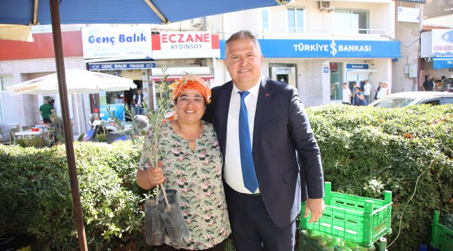 Urla Belediye Başkanı Selçuk Balkan, zirvenin ardından Urla Cumhuriyet Meydanında her salı kurulan Üretici Pazarında kadın üreticilere zeytin fidanı dağıtımı yaptı.
