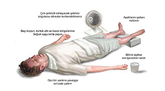 İlk yardımda; kişi hemen serin ve hava akımı olan bir yere alınmalı, sıkı giysileri gevşetilmeli, soğuk su veya soğutucularla (vantilatör, klima vb.) soğutulmaya çalışılmalı, bilinci kapalıysakesinlikle içmesi için sıvı verilmemeli ve en yakın sağlık kuruluşuna götürülmelidir. Gerekli durumlar da hava yolu açılmalı ve suni solunum yapılmalıdır.