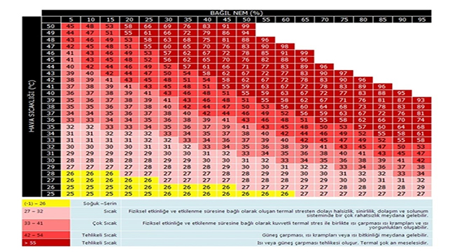 “Havada bulunanan bağıl nemim hissedilen sıcaklığa etkisi aşağıdaki tablodaki gibidir;”
